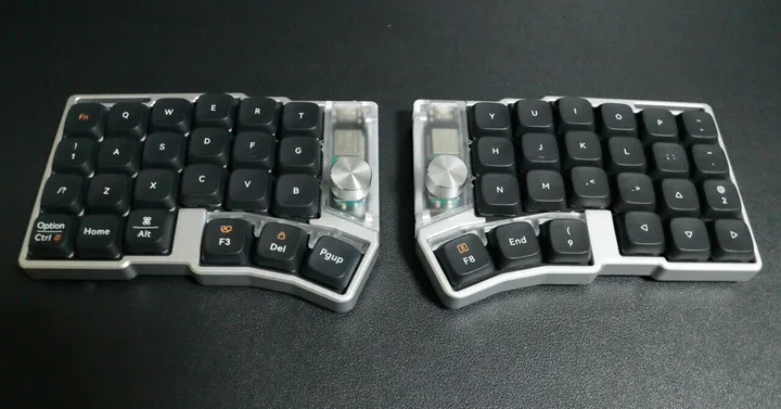 本製品はJezailFunder製のロープロファイルキーボードで、Bluetoothによる最大3台のデバイス接続に対応しています。特筆すべきは、6°から24°まで調整可能なテントモード(傾斜)機能を備えている点で、分割キーボードならではのエルゴノミクスに基づいた快適なタイピング環境を構築可能です。